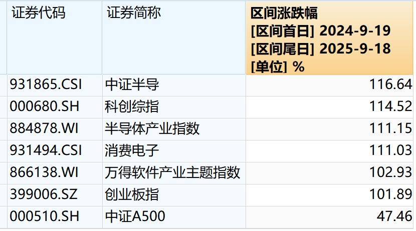 基本面“稳”,中证半导近一年直接翻倍,2024.9.19-2025.9.18期间涨幅高达116.64%!明显跑赢创业板、半导体产业、软件产业等同期大多数科技资产。
